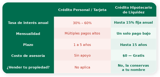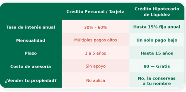 Obtén capital para pagar tus deudas, capital para tu negocio o proyectos con la tasa hipotecaria más baja del mercado. Sin vender tu propiedad. Con el respaldo de 25 años de experiencia.